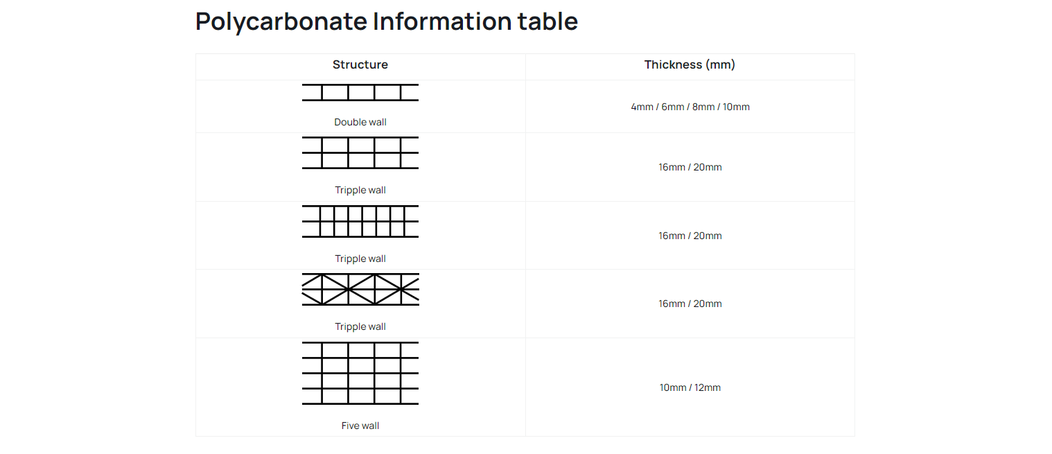 The polycarbonate sheets are available in thicknesses of 4, 6, 8, 10, 16 and 20 mm, custom length